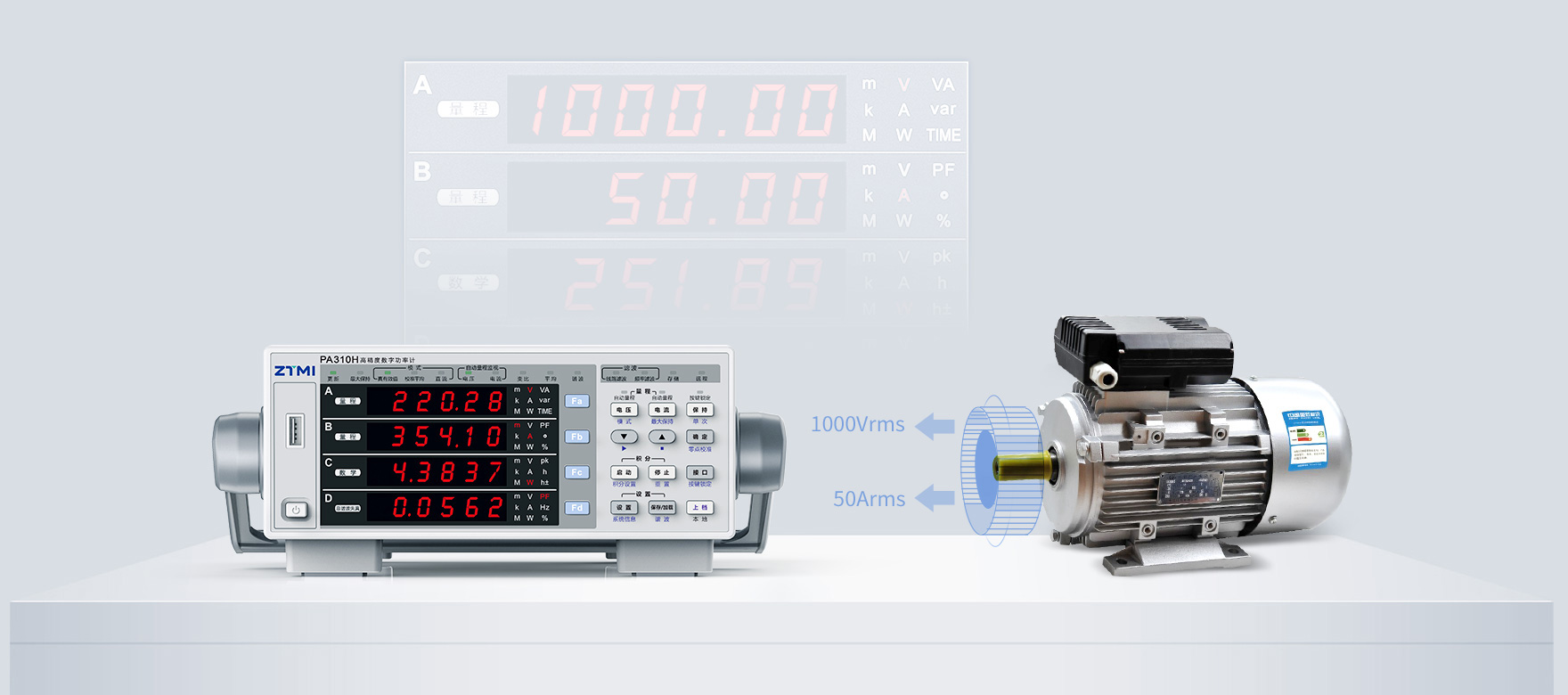 PA310H功率計(jì)采用了雙分流器技術(shù),它無(wú)需使用外部傳感器便可以直接測(cè)量高達(dá)1000V的電壓、50A的電流,可輕松滿(mǎn)足高達(dá)50KW的大功率測(cè)試要求。