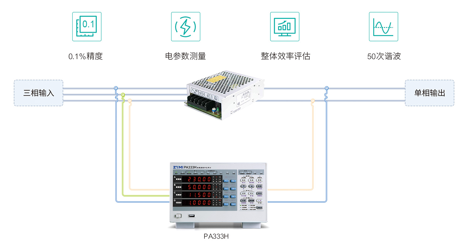 PA333H功率計三通道量程可單獨設置,在測量單相電源時,可直接開啟“單進單出”模式測量模塊效率。而面對三相電源時,可以開啟“單進三出”模式,輕松評估電源模塊整體效率。