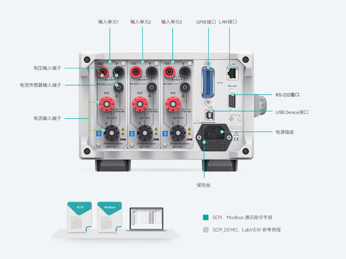 通訊接口是數據通訊的硬件基礎。PA300系列功率計標配LAN、GPIB、RS-232和USB Device接口,兼容SCPI、Modbus兩種通訊指令,保證了測試設備在自動化產線測試的系統集成中具備良好的兼容性。