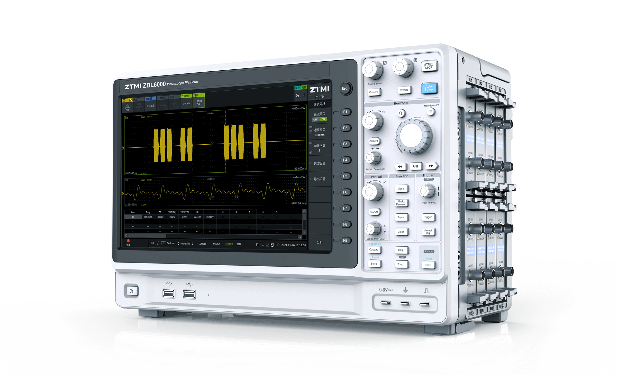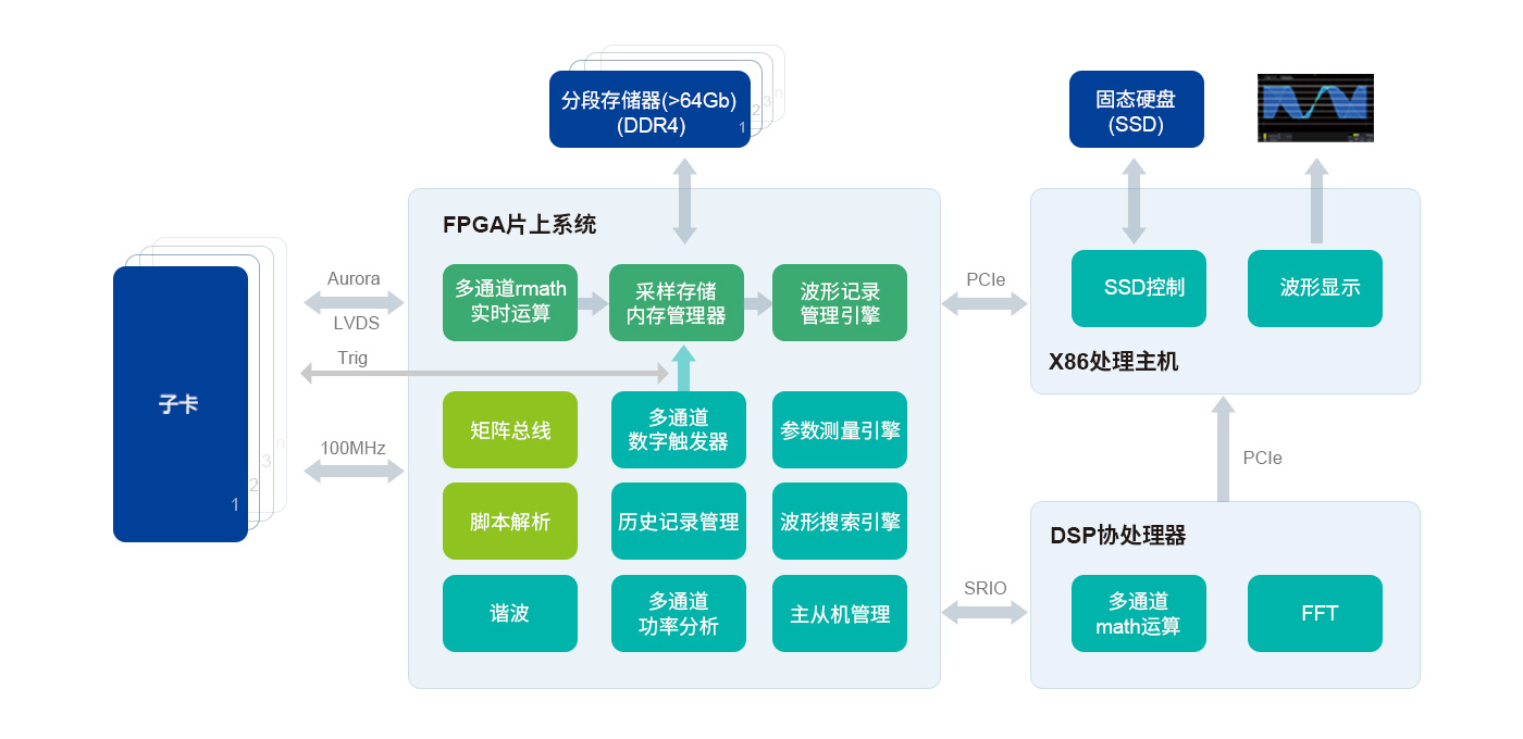 ZDL系列示波記錄儀從設(shè)計上將主機與子卡分開,主機包含了大規(guī)模的FPGA與DSP處理器,能快速處理數(shù)據(jù)并交由X86主機進行人機交互。而子卡只需要采集數(shù)據(jù),通過這樣的架構(gòu),隨著更多類型的采集卡加入,ZDL系列示波記錄儀將成為更全面的組合儀器。