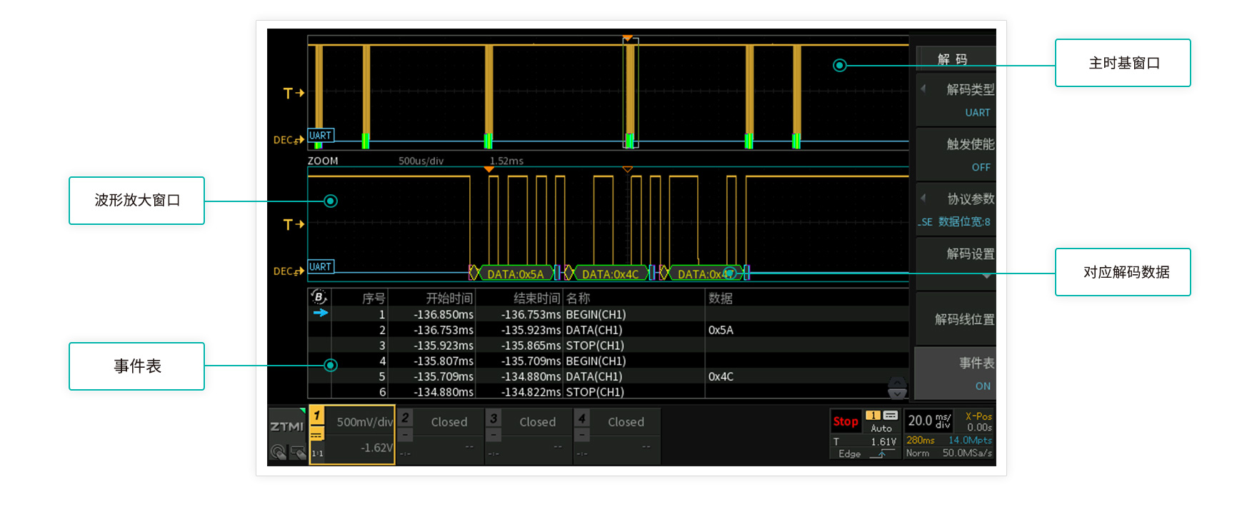 協(xié)議信號調(diào)試不只要關(guān)注波形質(zhì)量,更要關(guān)注波形對應(yīng)數(shù)據(jù),而協(xié)議解碼功能往往作為示波器的付費選配功能。ZDS1000示波器基于客戶需求免費標配了UART、 SPI、 IIC、 CAN、CAN-FD、LIN、FlexRay、USB、 PS/2、 DALI、 Wiegand、 1-Wire、DS18B20、 HDQ、 SD_SPI、 SD_SD、 Manchester、Diff-Manche、 Miller、 DHT11、 SHT11 共21種協(xié)議解碼,協(xié)議調(diào)試信手拈來。