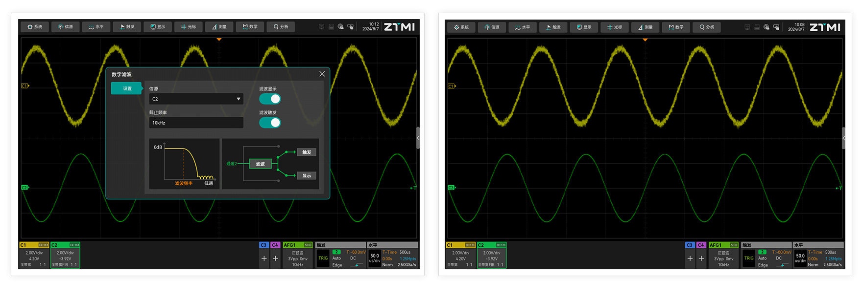 ZUS5000示波器內(nèi)置FIR硬件實時濾波器,可在10Hz-500MHz范圍內(nèi)任意調(diào)節(jié)示波器帶寬,精準(zhǔn)過濾特定頻點的噪聲與干擾信號,用更專業(yè)的手段讓工程師看到更真實的波形信號。