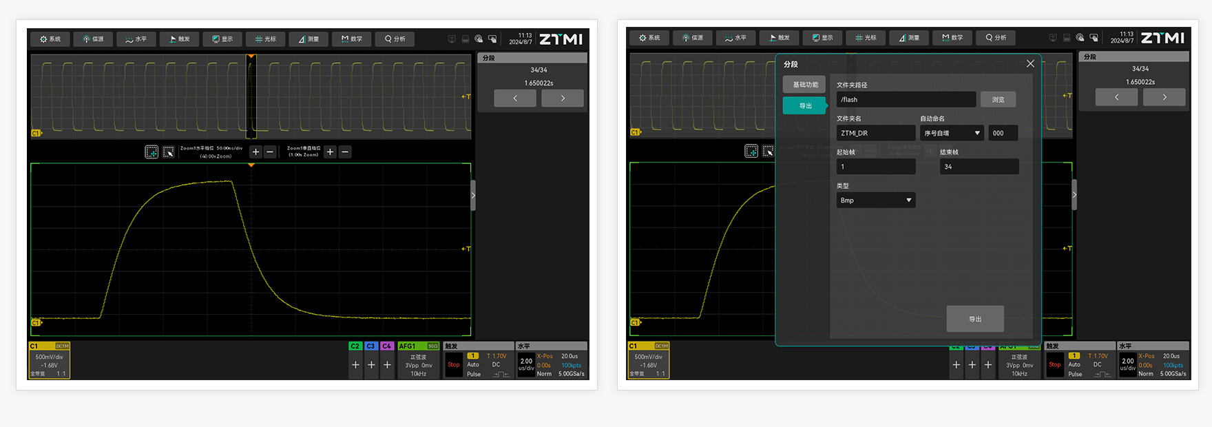 ZUS5000示波器提供的分段存儲功能,結(jié)合示波器合適的觸發(fā)條件后,可實現(xiàn)特定波形的長時間在線監(jiān)測,實現(xiàn)示波器本地進行歷史波形查看分析,并可通過數(shù)據(jù)導(dǎo)出方式導(dǎo)出歷史數(shù)據(jù)。