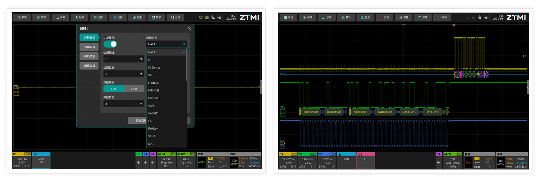 ZUS5000示波器提供了最多超40種串行通信協(xié)議解碼,并支持雙線解碼功能,可以實現(xiàn)同一時刻,不同協(xié)議的同時解析,這一實用功能將大大提升了工程師面向協(xié)議分析的效率。