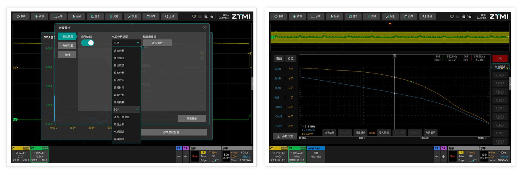 ZUS5000示波器提供的電源分析功能插件涵蓋了電源產(chǎn)品的輸入輸出特性測試,MOSFET、磁性元件、電容、電感等器件分析,調(diào)制波形測試,以及環(huán)路分析,PSRR測試分析,全方位評測電源產(chǎn)品的可靠性。