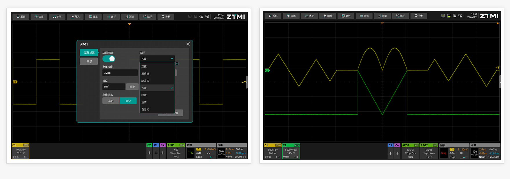 ZUS5000示波器內(nèi)置雙通道函數(shù)信號發(fā)生器,支持正弦波、三角波、方波、脈沖波等標(biāo)準(zhǔn)函數(shù)信號輸出,可調(diào)節(jié)信號初始相位、功能類型(掃頻、調(diào)制、猝發(fā))、占空比,頻率最高可達30MHz。