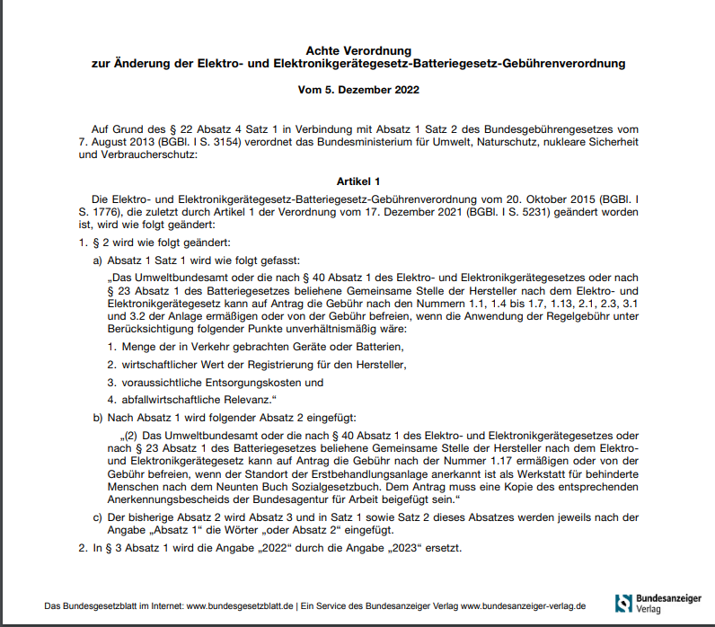 最近,德國聯邦法規公布了2023年德國最新的規定EPR最新的官費價格。WEEE2023年將大幅調整電池支付的兩項費用。