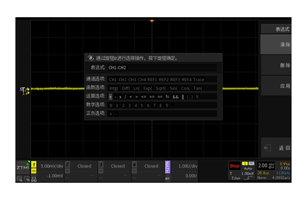 3. 打開ZDS3024E的數學運算功能中的高級計算進行自定義運算,選擇"CH1 - CH2",屏幕顯示的就是市電真實波形,數值精準且安全
