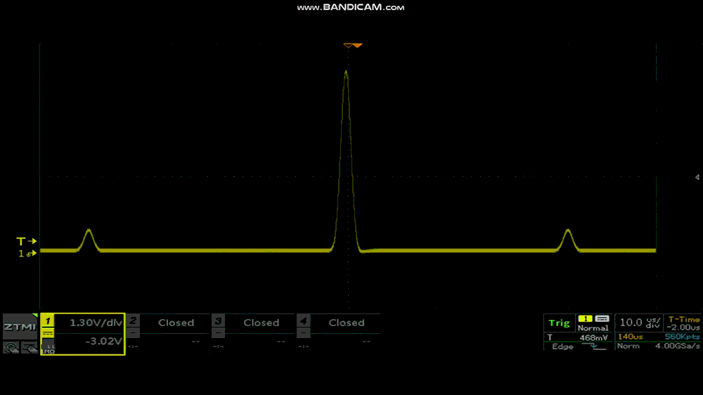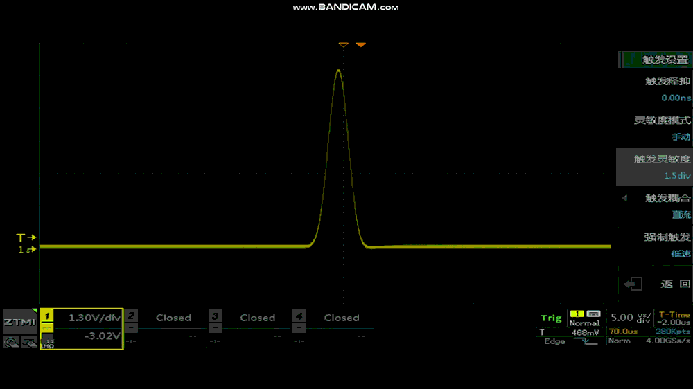 現(xiàn)象:波形在屏幕上劇烈抖動(dòng),觸發(fā)位置飄忽不定,甚至無(wú)信號(hào)輸入時(shí)也在持續(xù)觸發(fā)。觀察動(dòng)圖可以看到原波形存在毛刺尖峰信號(hào),在觸發(fā)靈敏度為0div時(shí)出現(xiàn)誤觸發(fā)的情況。
