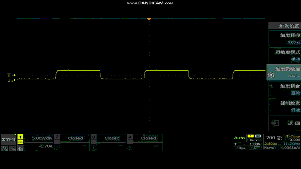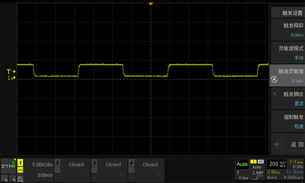它就像示波器的"智能過(guò)濾器",ZDS3024E的0~1.5div觸發(fā)靈敏度可調(diào)特性,讓工程師能根據(jù)具體信號(hào)特性精確匹配最優(yōu)參數(shù)。(ZDS3024E示波器觸發(fā)靈敏度默認(rèn)為0.3div。)