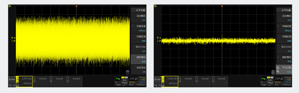 平均模式的核心優(yōu)勢在于能精準(zhǔn)測量含噪聲的重復(fù)信號,這里我們通過信號發(fā)生器輸出一個(gè)噪聲信號輸出到我們的ZDS3054E示波器,通過切換模式對比,可以看到,標(biāo)準(zhǔn)模式下噪聲比較明顯,平均模式下可以降低隨機(jī)噪聲,使得重復(fù)輪廓更加清晰。