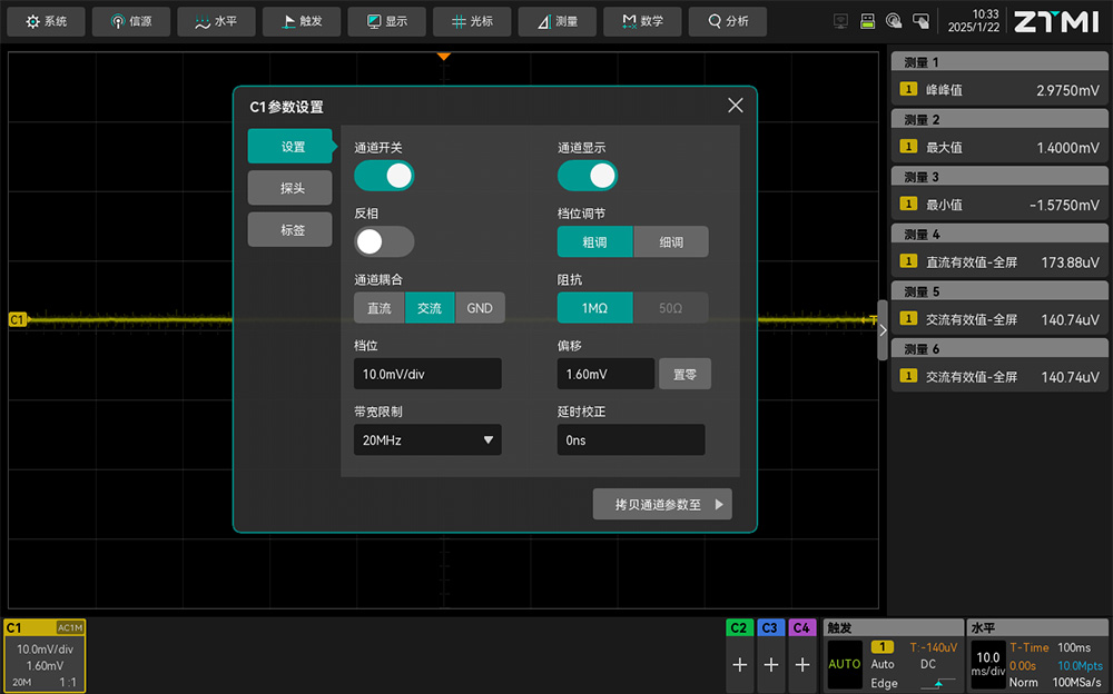 在測量紋波電壓時,選擇直流有效值來表達(dá)測量結(jié)果更為準(zhǔn)確。具體可以使用示波器中的【measure】功能進(jìn)行自動測量,ZUS5054Pro支持32種參數(shù)測量,最多同時顯示24種參數(shù),基于12bit高位數(shù)ADC和大存儲深度,實現(xiàn)電源紋波參數(shù)的測量的同時,還支持光標(biāo)功能(Cursor)手動卡值。