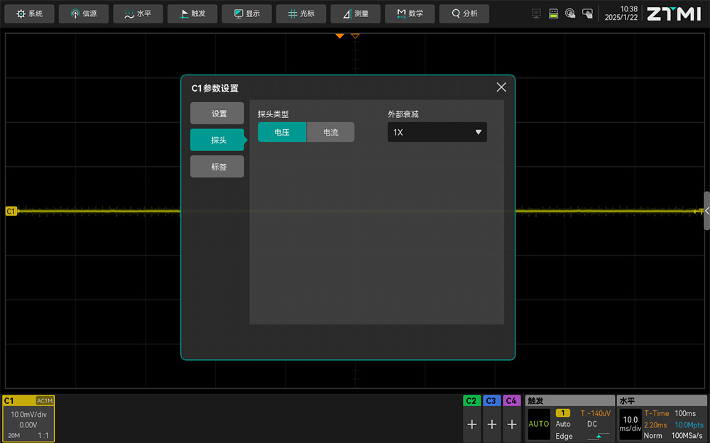 示波器通道阻抗有1MΩ和50Ω兩種選擇。使用無源探頭時,通常選擇1MΩ。同時,探頭要選擇合適的擋位,電壓較大或者對帶寬要求較高時,可使用X10檔;普通情況下建議使用X1檔,以減少紋波測量的影響。示波器通道的衰減比也要調(diào)成相應(yīng)的檔位。