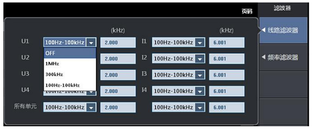 線路濾波器屬于低通濾波器,會(huì)去除信號(hào)的高頻成分(高頻諧波成分),僅測量低頻成分。需注意:開啟后會(huì)導(dǎo)致電壓RMS、電流RMS、有功功率P等測量值發(fā)生變化,非必要情況不建議開啟。