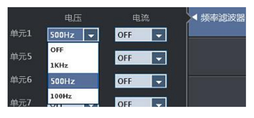 PA5000H支持100Hz、500Hz、1kHz、45~65Hz(IEC諧波模式使用)的頻率濾波器。頻率濾波器可被用于精確檢測過零點(diǎn),當(dāng)輸入信號(hào)頻率在1kHz以下時(shí),建議開啟頻率濾波器,獲得更準(zhǔn)確的過零點(diǎn)檢測。