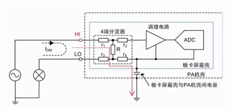 電流串在L線(xiàn)或N線(xiàn)也會(huì)影響精度。設(shè)備內(nèi)部板卡屏蔽殼與機(jī)殼間存在雜散電容(空間中兩個(gè)絕緣導(dǎo)體存在電容),若電流通道接入高端,會(huì)產(chǎn)生泄漏電流(圖中紅色標(biāo)記線(xiàn))。因此電流測(cè)量輸入應(yīng)串在共模電壓較低的地方(低端)。